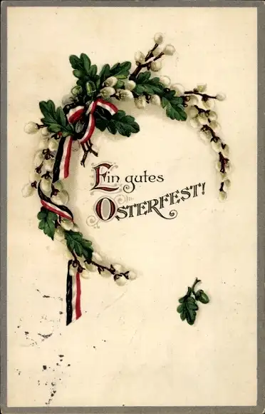 Präge Ak Glückwunsch Ostern, Weidenkätzchen, Eichenlaub, Patriotik
