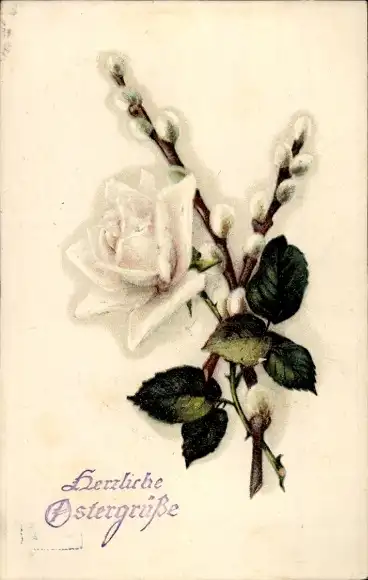 Präge Ak Glückwunsch Ostern, Weidenkätzchen, Weiße Rose
