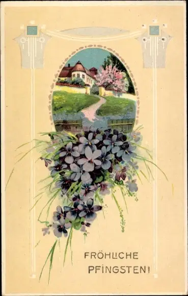 Präge Ak Glückwunsch Pfingsten, Dorfpartie, Veilchen