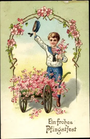 Präge Ak Glückwunsch Pfingsten, Junge, Blumenstrauß, Gratulant