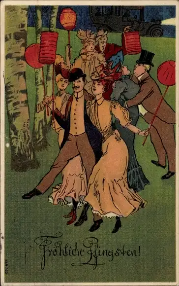 Präge Ak Glückwunsch Pfingsten, Liebespaare mit Laternen