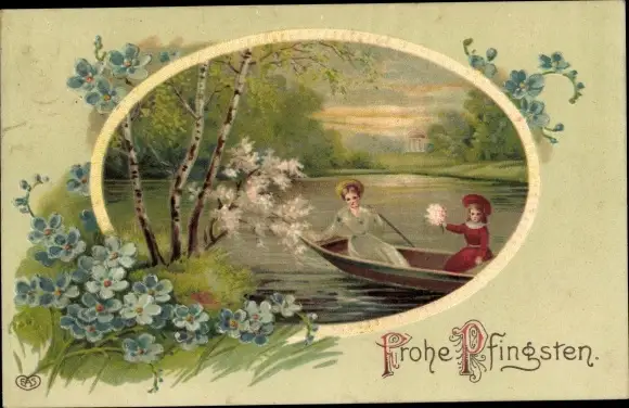 Präge Ak Glückwunsch Pfingsten, Mädchen im Ruderboot, Birken, Vergissmeinnicht