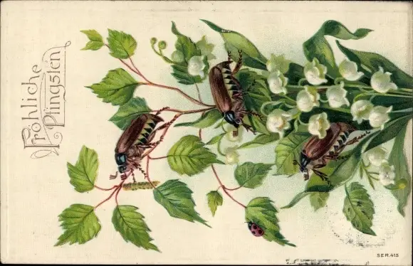 Präge Ak Glückwunsch Pfingsten, Maikäfer, Maiglöckchen