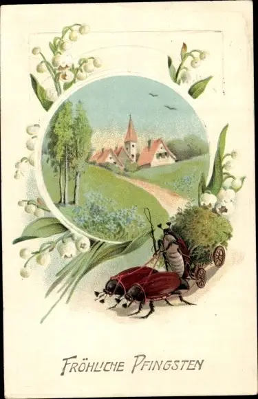Präge Ak Glückwunsch Pfingsten, Maikäfer, Maiglöckchen, Häuser