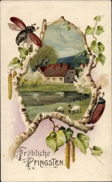 Präge Ak Glückwunsch Pfingsten, Maikäfer an der Birke, Dorfpartie, Schafe