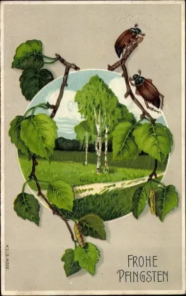 Präge Ak Glückwunsch Pfingsten, Maikäfer auf Birkenzweig