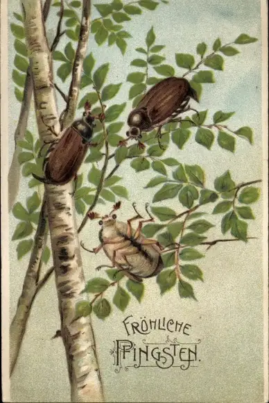 Präge Ak Glückwunsch Pfingsten, Maikäfer auf Birkenzweigen