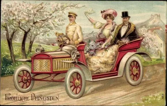Präge Ak Glückwunsch Pfingsten, Paar im Automobil, Chauffeur