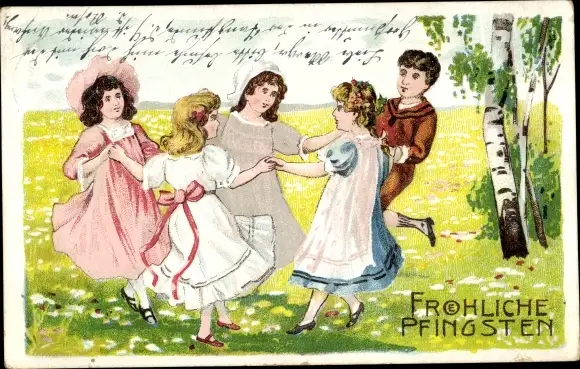 Präge Ak Glückwunsch Pfingsten, Tanzende Kinder, Birken