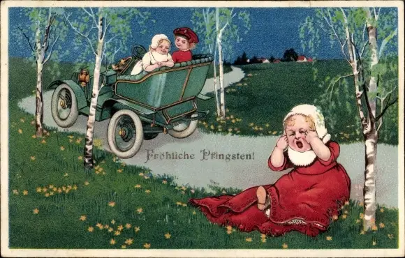 Präge Ak Glückwunsch Pfingsten, Weinendes Mädchen im Gras sitzend, Automobil