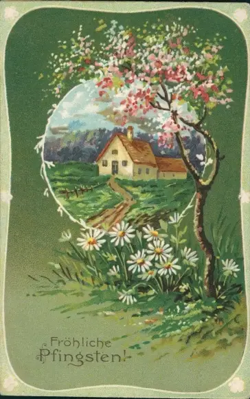 Präge Ak Glückwunsch Pfingsten, Wohnhaus, Blühender Baum, Margeriten