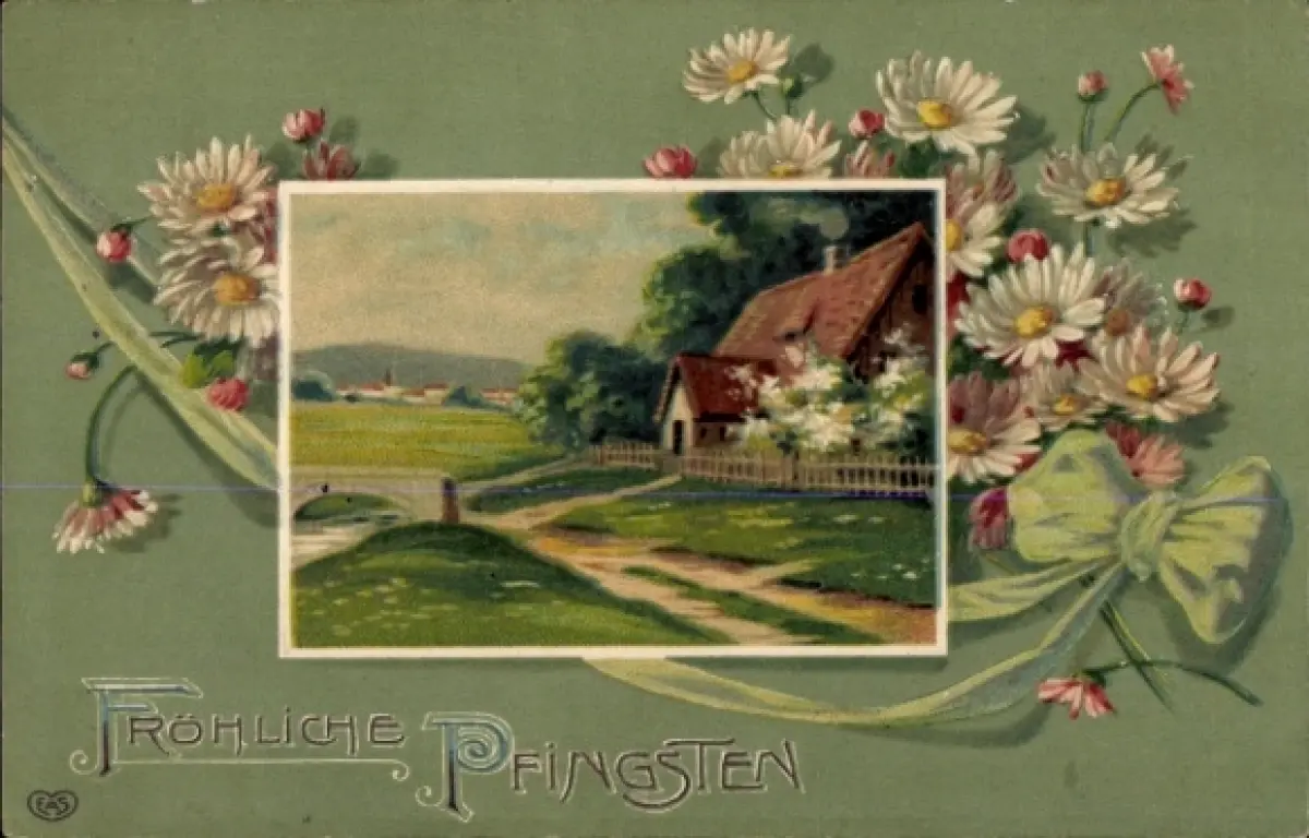 Präge Ak Glückwunsch Pfingsten, Wohnhaus, Margeriten