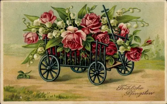 Präge Ak Glückwunsch Pfingsten, Ziehwagen mit Blumen