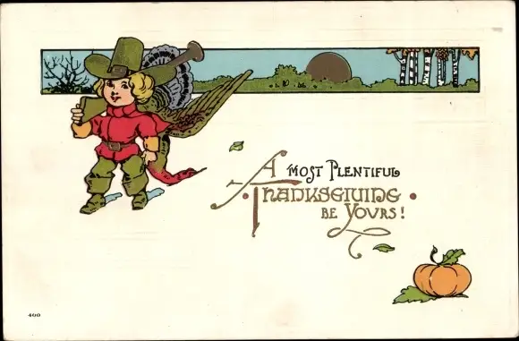 Präge Ak Glückwunsch Thanksgiving, Kürbis, Junge, Gewehr, Truthahn
