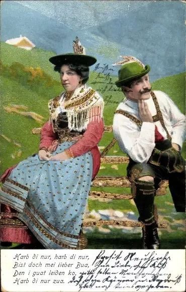 Präge Ak Harb di nur, Liebespaar in bayrischen Trachten