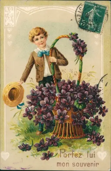 Präge Ak Junge, Blumenkorb, Veilchen, Souvenir