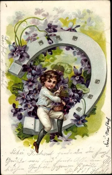 Präge Ak Junge, Hufeisen, Veilchen, Kitsch