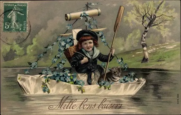 Präge Ak Kind im Ruderboot, Vergissmeinnicht, Birke