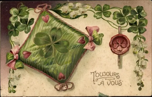Präge Ak Kissen, Glücksklee, Siegel, Kitsch