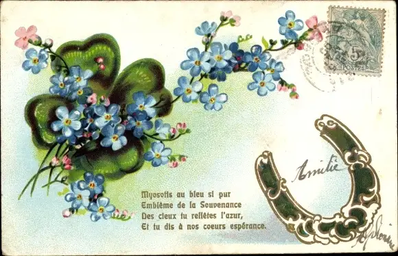 Präge Ak Kitsch, Hufeisen, Kleeblätter, Vergissmeinnicht