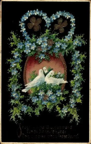 Präge Ak Kitsch, Tauben, Glücksklee, Hufeisen, Vergissmeinnicht