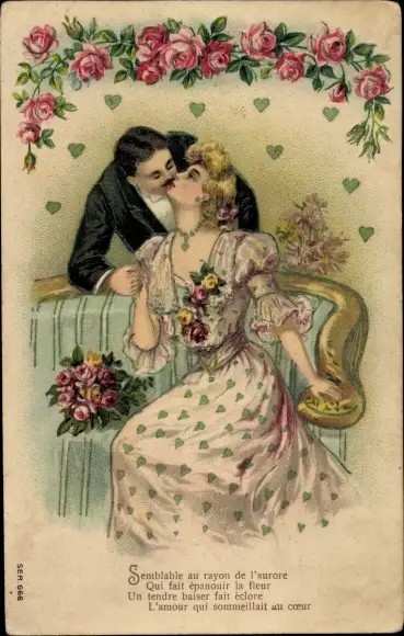 Präge Ak Liebespaar, Kuss, Rosen, Blumen, Liebe
