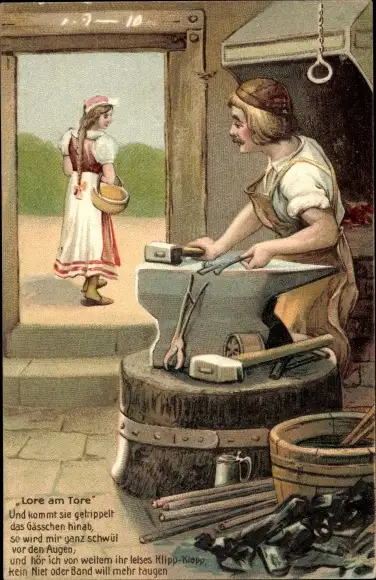 Präge Ak Lore am Tore, Schmied am Amboss, Liebespaar