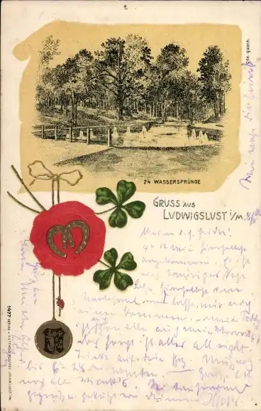 Präge Ak Ludwigslust in Mecklenburg, Wassersprünge, Siegel, Hufeisen, Kleeblatt