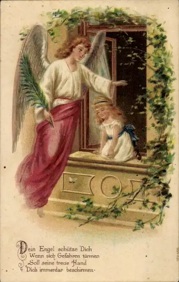 Präge Ak Mädchen auf einem Fensterbrett, Schutzengel
