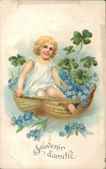 Präge Ak Mädchen im Korb, Glücksklee, Vergissmeinnicht