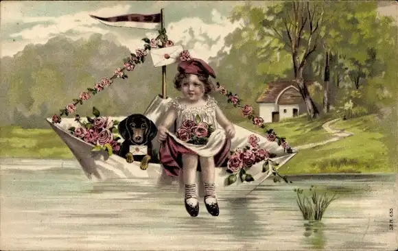Präge Ak Mädchen in einem Papierboot, Dackel, Rosen, Blumengirlanden