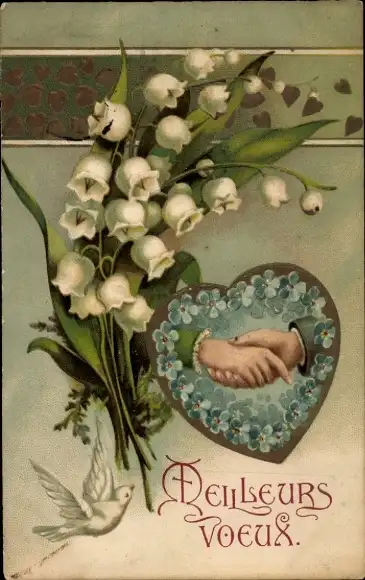 Präge Ak Maiglöckchen, Händedruck, Taube, Vergissmeinnicht, Kitsch