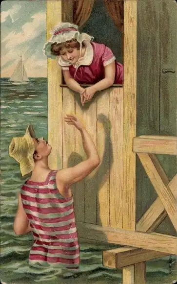 Präge Ak Mann und Frau in Badekleidung, Bademode