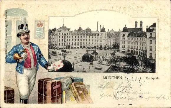 Präge Ak München Bayern, Karlsplatz, Postbote