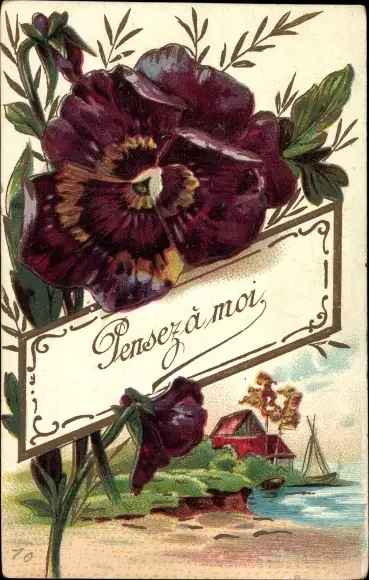 Präge Ak Pensez a moi, Stiefmütterchen, Dorf, Segelboot