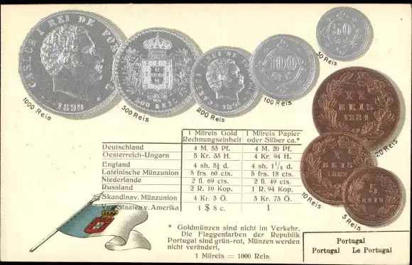 Präge Ak Portugal, Münzen, Fahne, Reis
