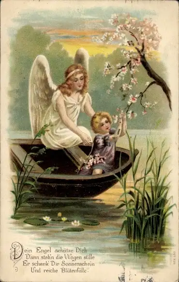 Präge Ak Schutzengel, Engel wacht über Mädchen in einem Boot