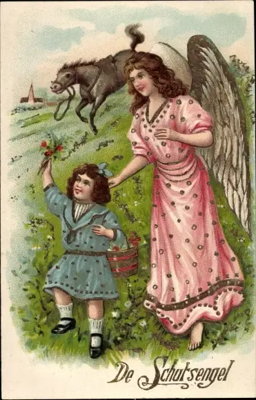 Präge Ak Schutzengel, Kind auf einer Wiese, durchgehendes Pferd