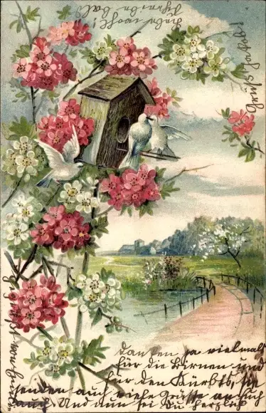 Präge Ak Tauben am Vogelhäuschen, Blumen