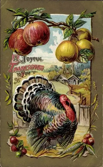 Präge Ak Thanksgiving, Truthahn, Früchte, Äpfel am Baum