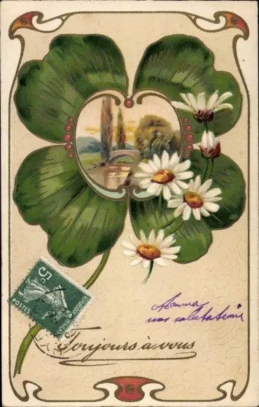 Präge Ak Toujours avous, Glücksklee, Margeriten