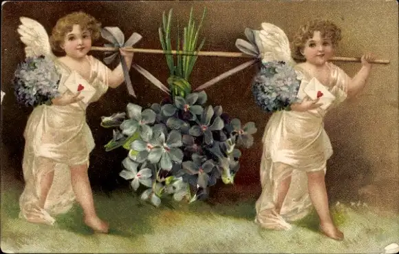 Präge Ak Zwei Engel mit Blumenstrauß, Schultertrage, Kitsch