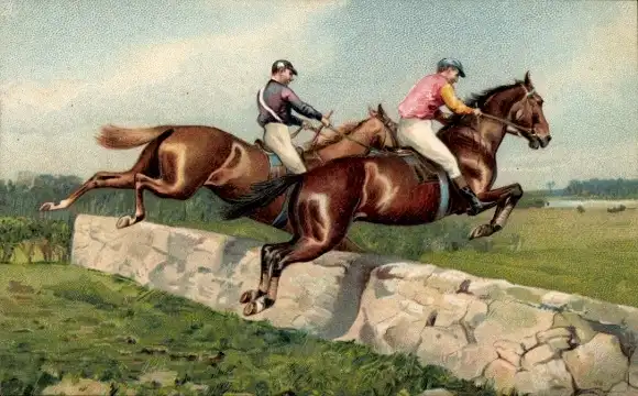 Präge Ak Zwei Springreiter im Sprung über eine Mauer