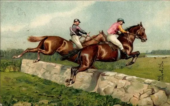 Präge Ak Zwei Springreiter im Sprung über eine Mauer