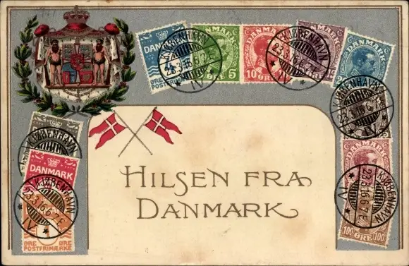 Präge Briefmarken Wappen Ak Dänemark, Dänische Fahne