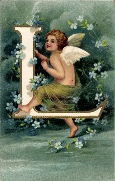 Präge Buchstaben Ak Buchstabe L, Engel, Vergissmeinnicht