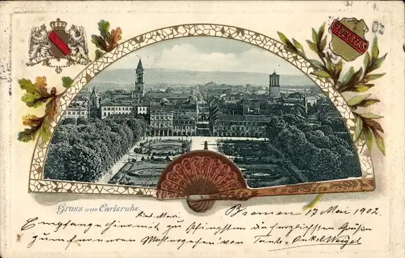 Präge Fächer Passepartout Ak Karlsruhe in Baden, Panorama