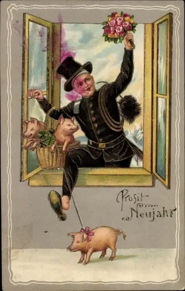 Präge Glitzer Ak Glückwunsch Neujahr, Schornsteinfeger, Schweine, Glücksklee