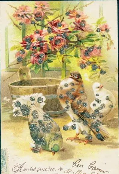 Präge Glitzer Ak Tauben, Blühende Rosen, Waschwanne