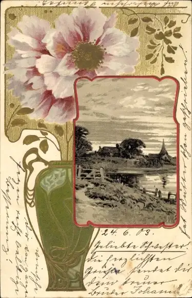 Präge Jugendstil Litho Blumen, Blumenvase, Haus, Teich